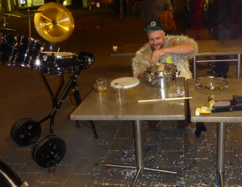 Der Paukist der Gugge Gülle Schlüch aus Basel, seines Zeichen Instrumentenbauer, beim Stimmen und Reparieren von Trommeln und Pauken verschiedener Gränchner Guggemusige...